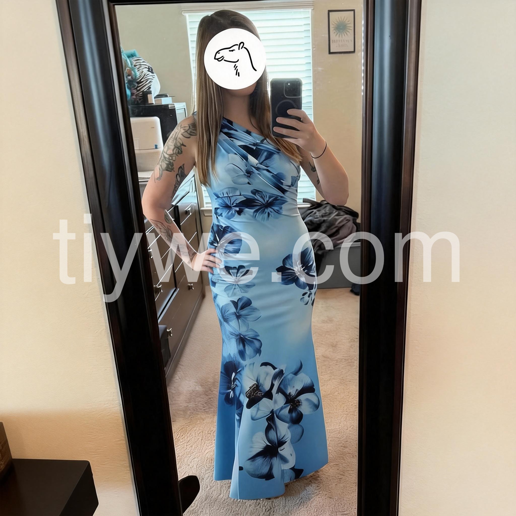 If you want to turn heads, buy this dress. The asymmetrical neckline is super flattering and the blue floral print is unique. I received compliments all night long at my friends destination wedding.