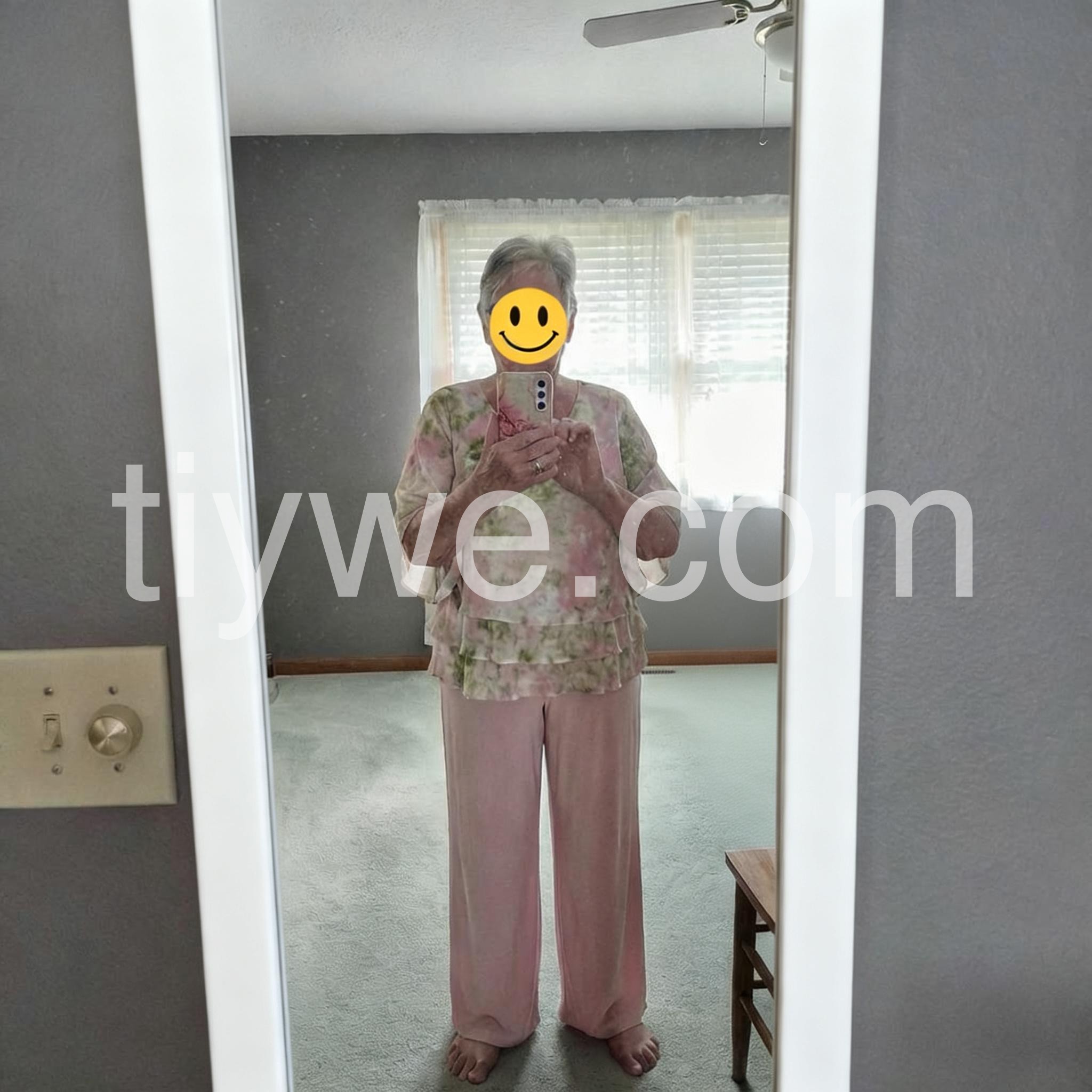 Beautiful outfit! The soft pink color of the pants matches the top flawlessly. It looks much more expensive than it is. Highly recommend for any mature woman looking for a classy event outfit.