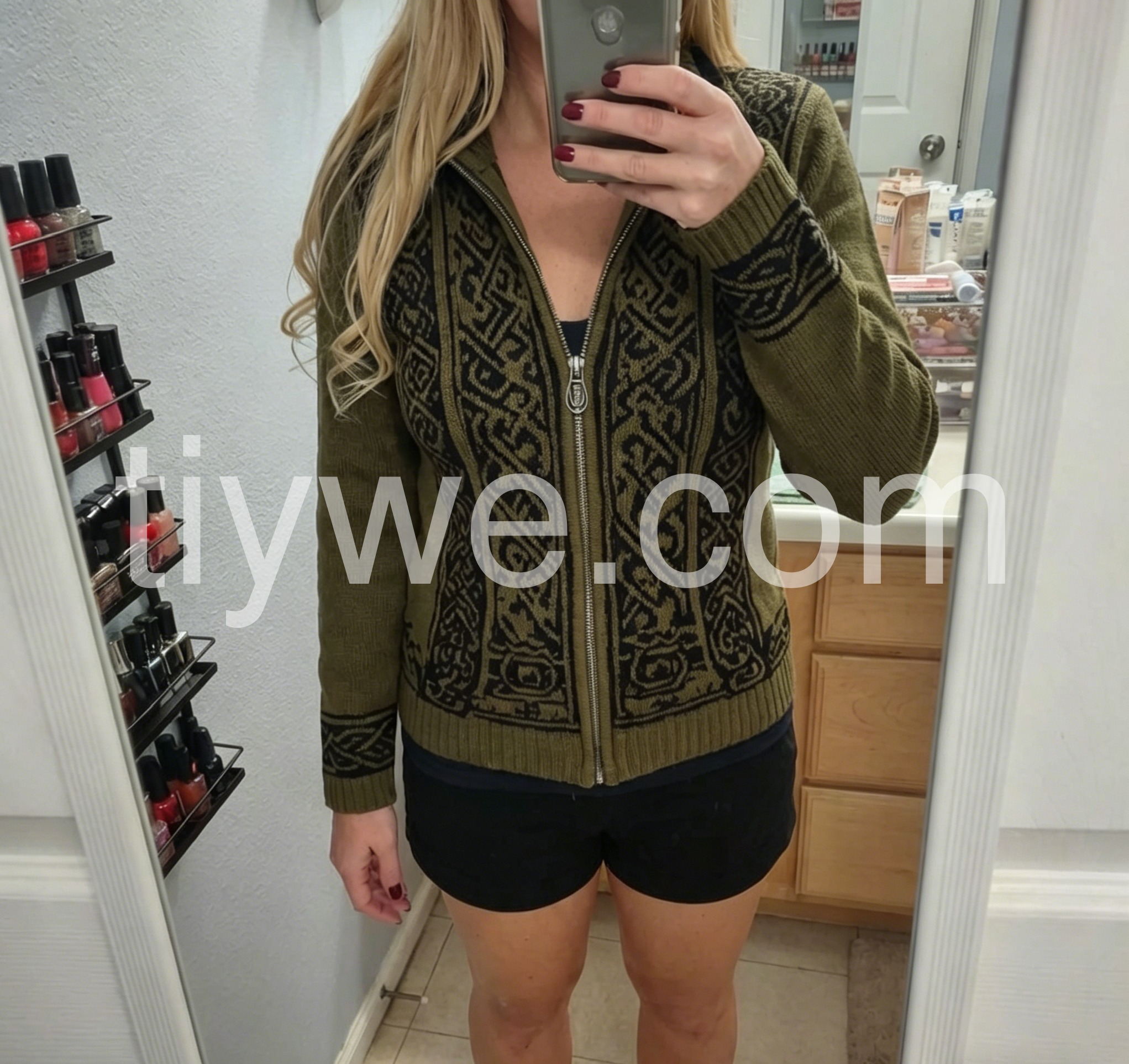 I’m obsessed with this vintage-style knit jacket! The earthy olive hue and ornate Nordic-inspired pattern feel so timeless and unique, way more interesting than basic sweaters. The wool-blend fabric is incredibly soft and insulating, perfect for layering over tees or turtlenecks. The fitted silhouette flatters my figure without being tight, and the silver zipper adds a sleek, polished touch. It’s become my go-to for weekend hikes, coffee runs, and even casual date nights—versatile, stylish, and so cozy!