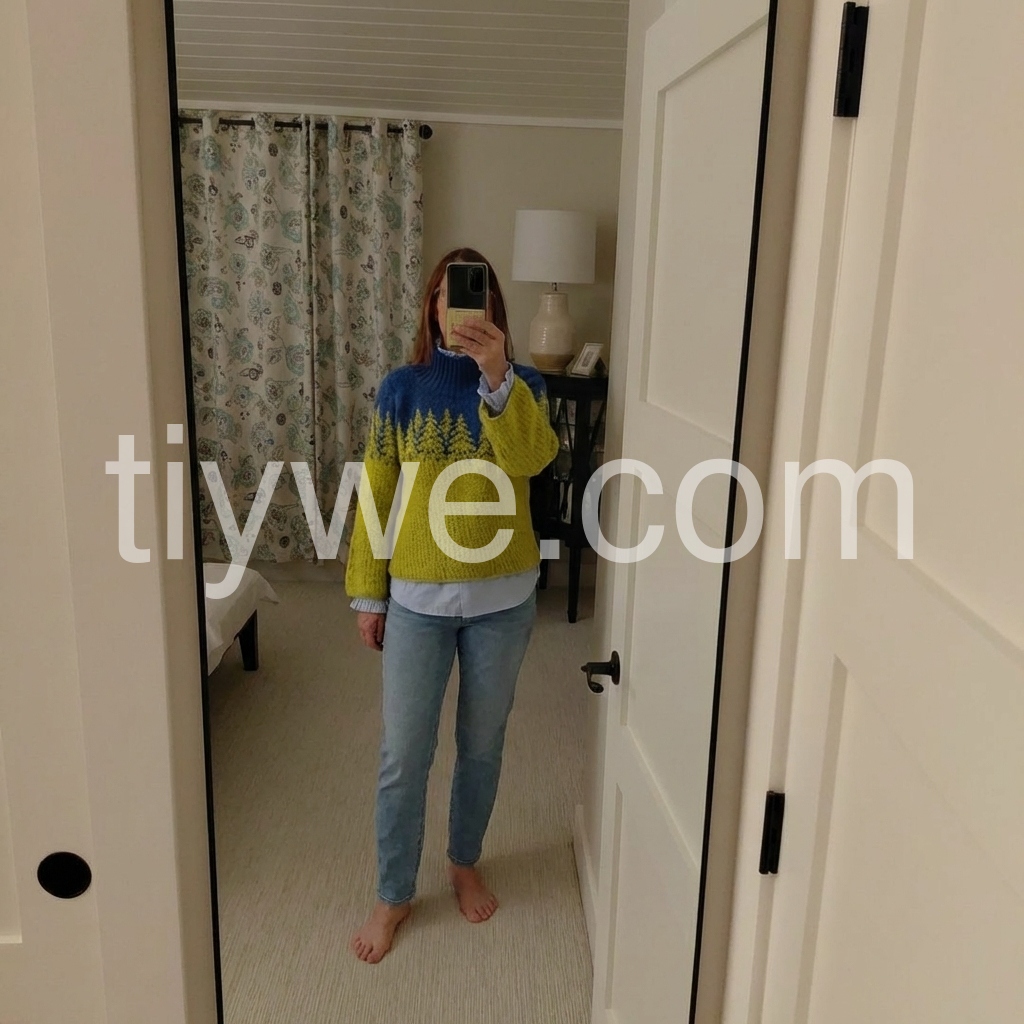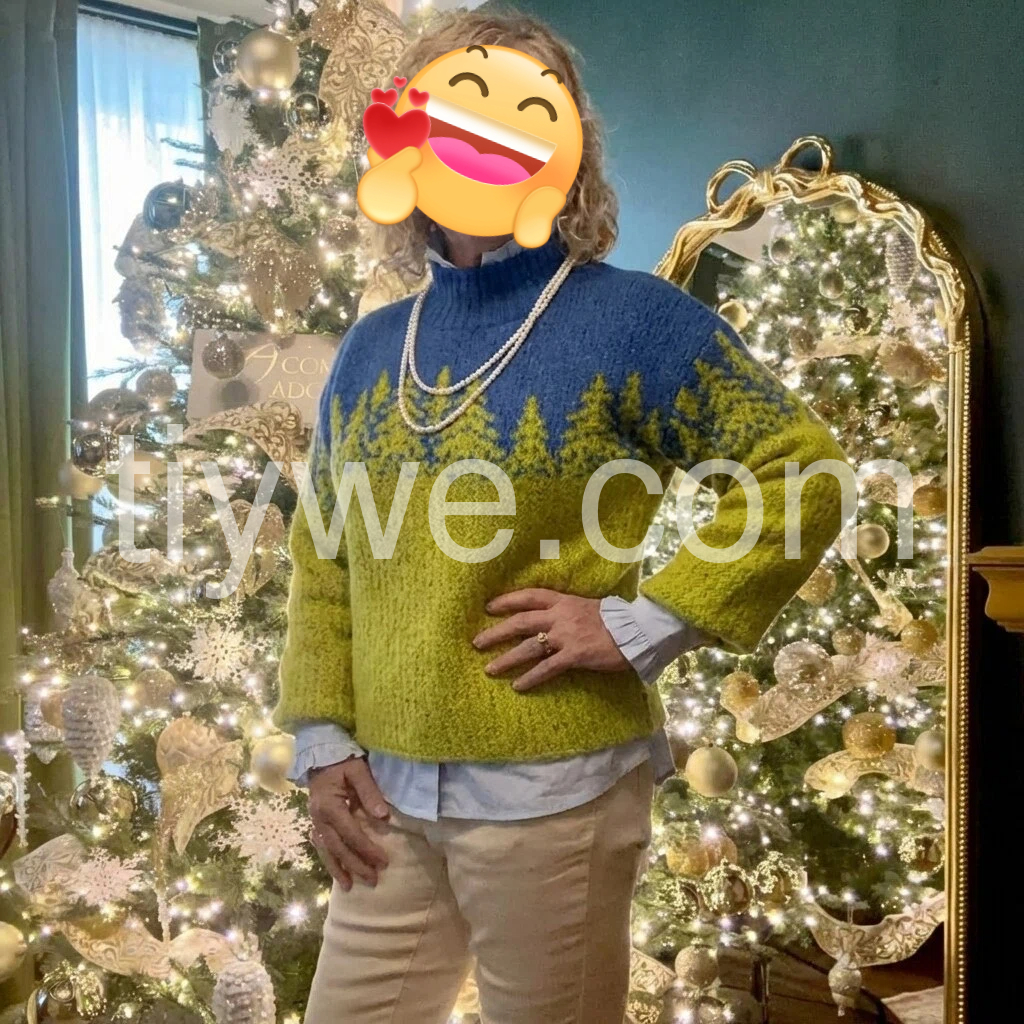 Great purchase! This sweater is incredibly soft and warm, perfect for cold weather. The design is so cute—those little trees are such a sweet detail, and the color contrast is bold but stylish. The bell sleeves are a nice touch, adding a feminine flair without being too frilly. It fits well, not too tight or too baggy, and the high neck is great for blocking out the wind. I’ll definitely be buying more colors if they become available!