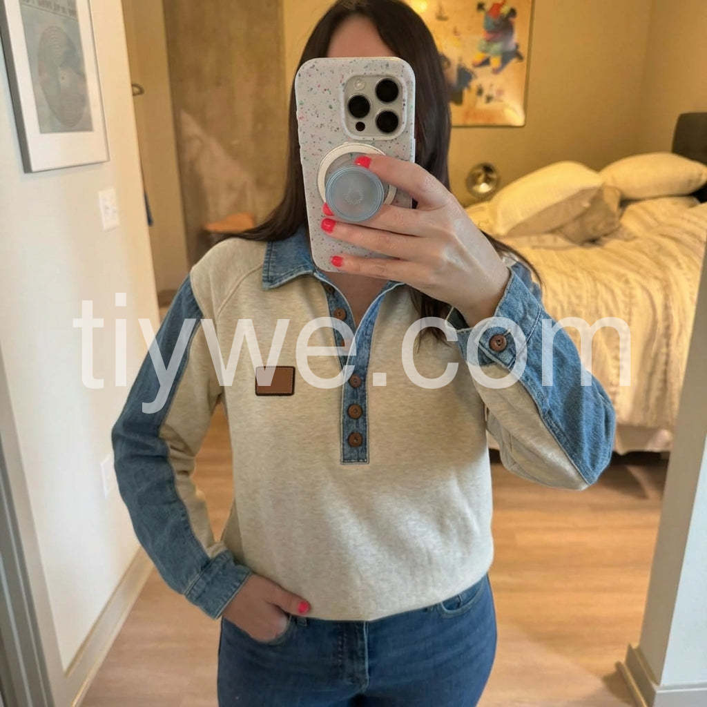 I absolutely love this top! The denim details on the sleeves and collar give it such a unique look. It is super comfortable and fits perfectly. Great for casual weekends.