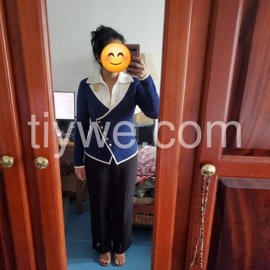 I’m so happy with this purchase. The sweater design is stylish and distinctive, especially with the contrast collar and the gold buttons. It feels soft and cozy, yet still structured enough to look polished. I appreciate how it holds its shape and looks neat even after wearing. Overall, it’s a fantastic item.