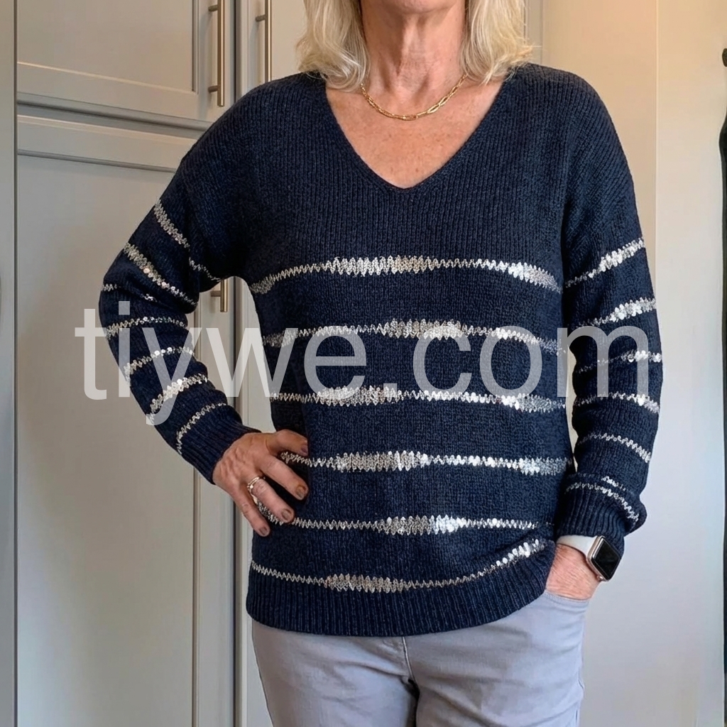 True to size and color. This sweater is exactly as shown and fits true to size. Perfect thickness for either wearing alone or with layers.