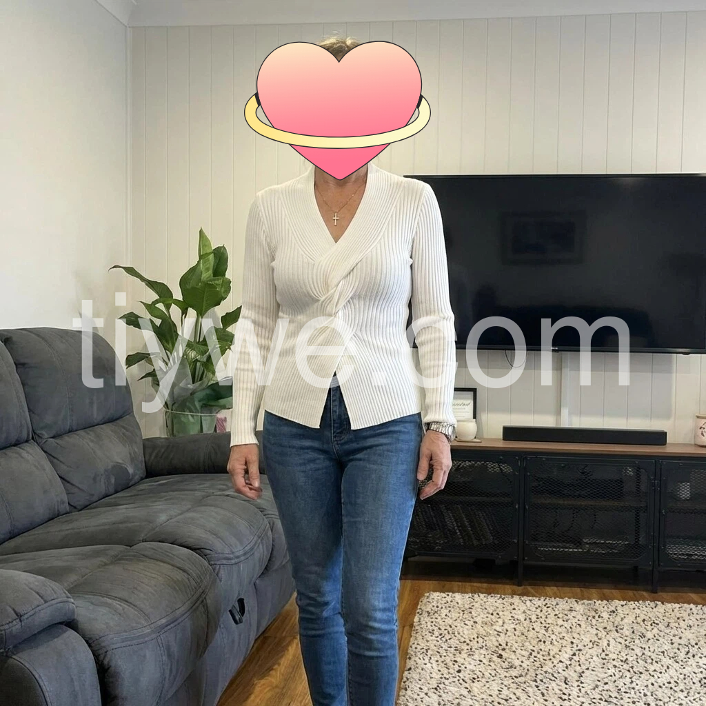 I absolutely love this sweater! The ribbed knit texture looks really nice, and the V-neck is very flattering. It’s lightweight but still warm, and it feels comfortable against the skin. The fit is flattering through the body and the sleeves sit well. I wore it on a beach day and it was perfect for the breeze. It matches the photos perfectly—great quality!
