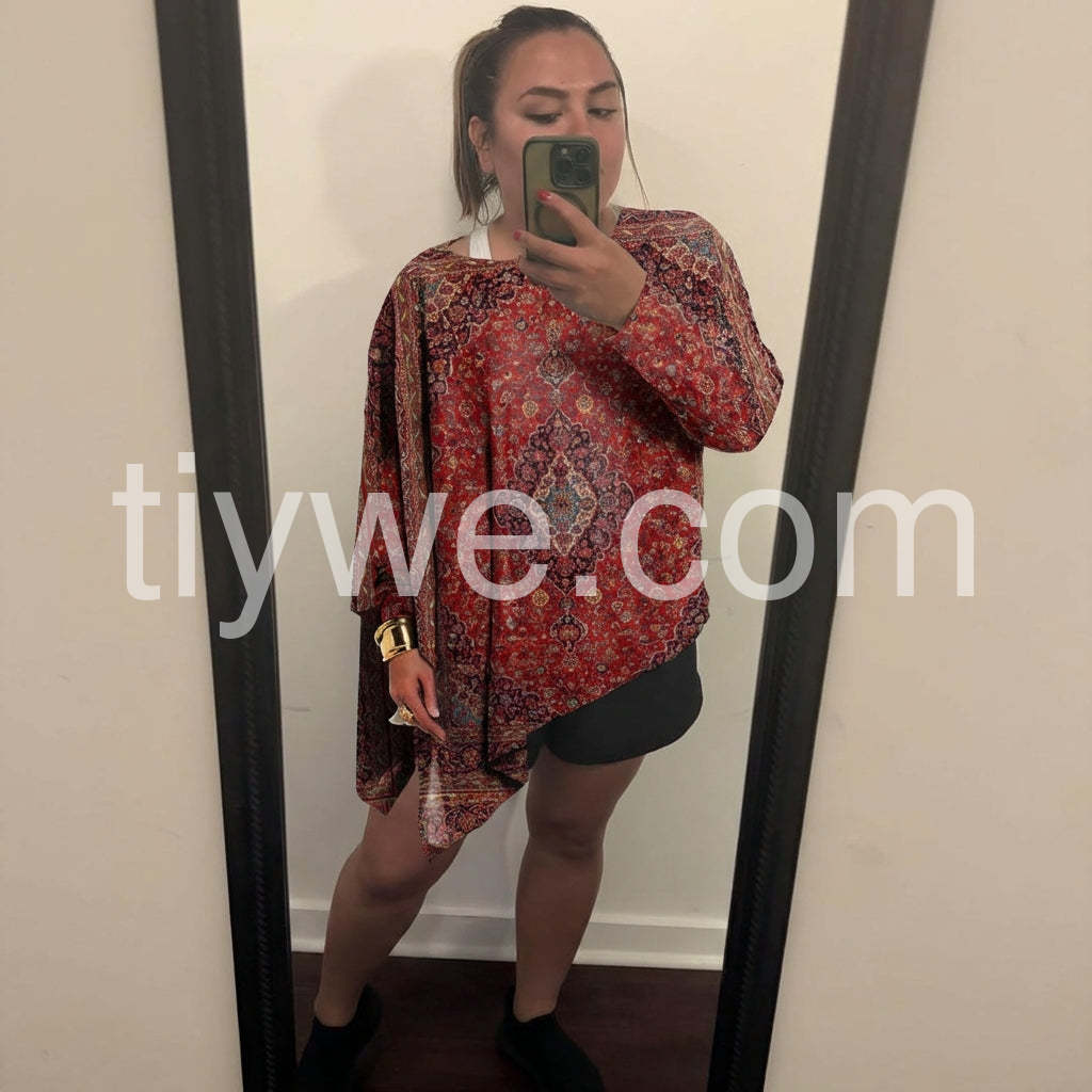 If you are looking for a top that is forgiving and stylish, this is it. The asymmetrical cut creates a lovely silhouette that elongates the body. The vintage rug pattern is gorgeous in person. Very happy with my purchase.
