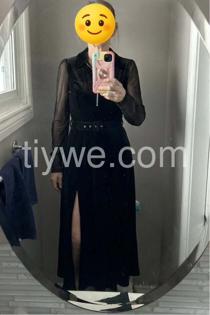 I absolutely love this dress! The black color is gorgeous and the fit is very flattering, especially with the waist belt. The front zipper/V-neck detail gives it a stylish look, and the long sleeves make it feel perfect for dressing up. The fabric hangs beautifully and the skirt has a nice flow. It looks just like the photos and feels high quality.