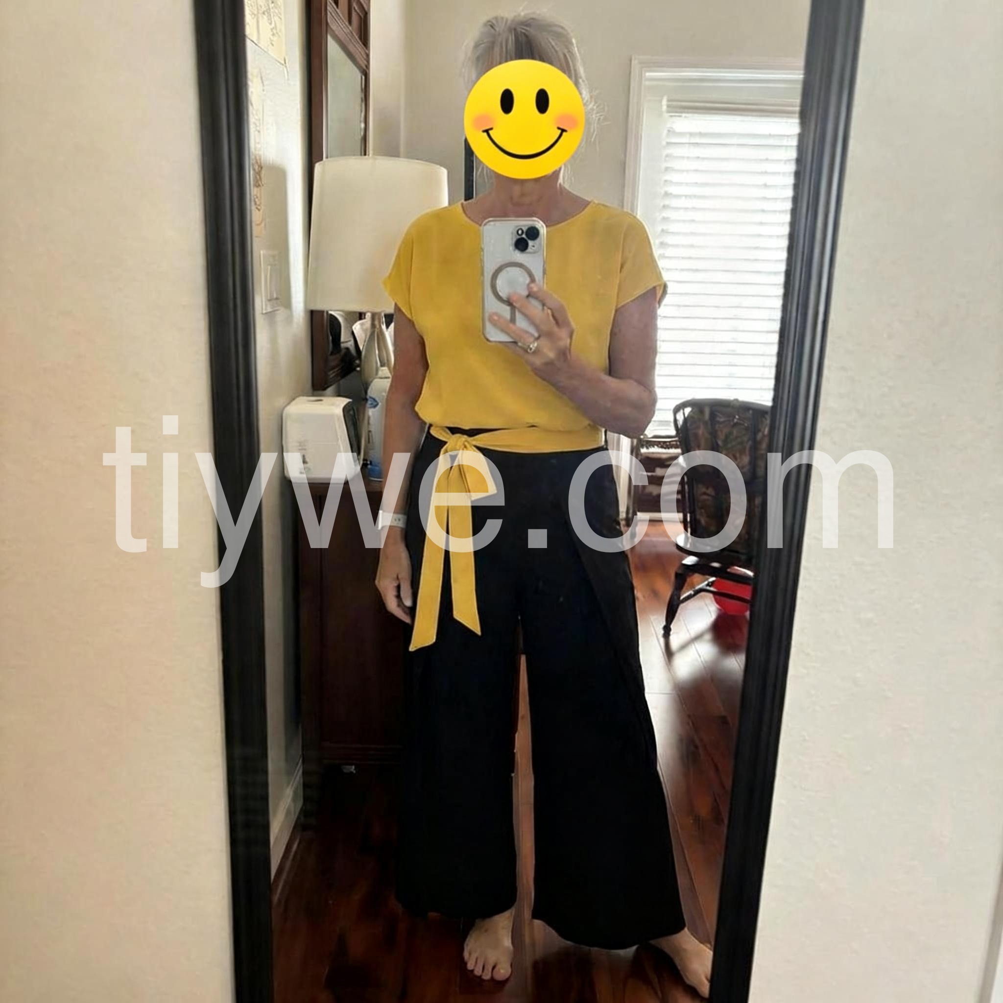 Love the bold color combo! The mustard-yellow top is airy and flattering, and the wide-leg black pants with the yellow waist tie create a chic, modern silhouette. Perfect for casual days out.